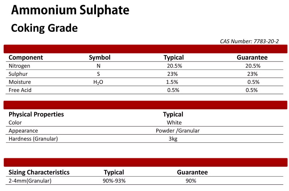 ❯ Ammonium Sulphate -Caprolactam Grade -Steel Grade -Coking Grade CAS No.:7783-20-2 EINECS No.:231-984-1 Formula:(NH4)2.SO4 Molecular Weight:132.1