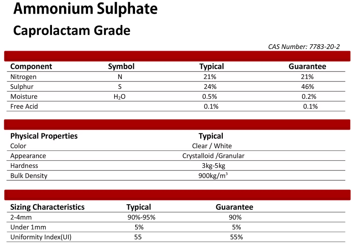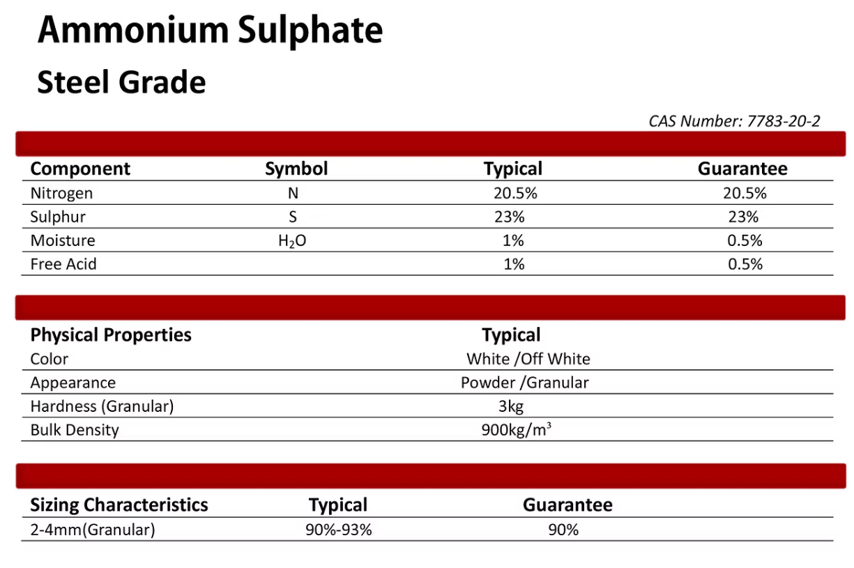 ❯ Ammonium Sulphate -Caprolactam Grade -Steel Grade -Coking Grade CAS No.:7783-20-2 EINECS No.:231-984-1 Formula:(NH4)2.SO4 Molecular Weight:132.1